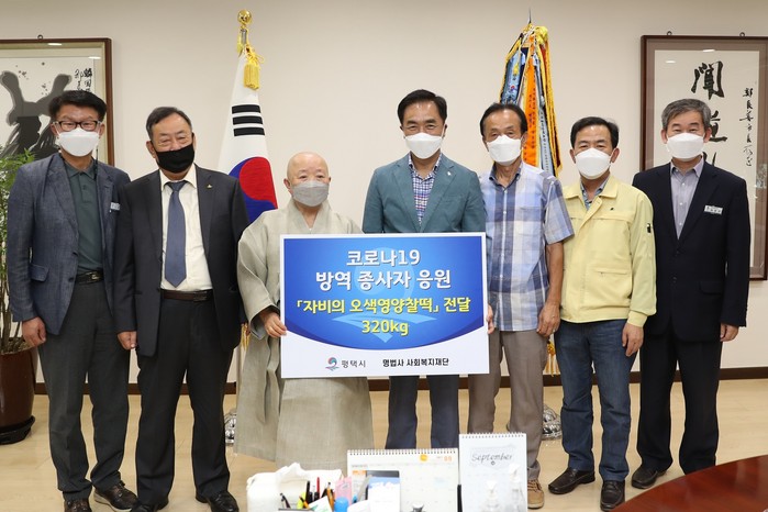 [로컬세계 김병민 기자]경기 평택시 명법사 사회복지재단(주지 화정스님, 이하 명법사)에서는 지난 16일 코로나19 방역 업무를 수행하고 있는 보건소 직원 및 방역 종사자들을 위해 평택시에 ‘자비의 오색영양찰떡 320㎏’을 전달했다.
