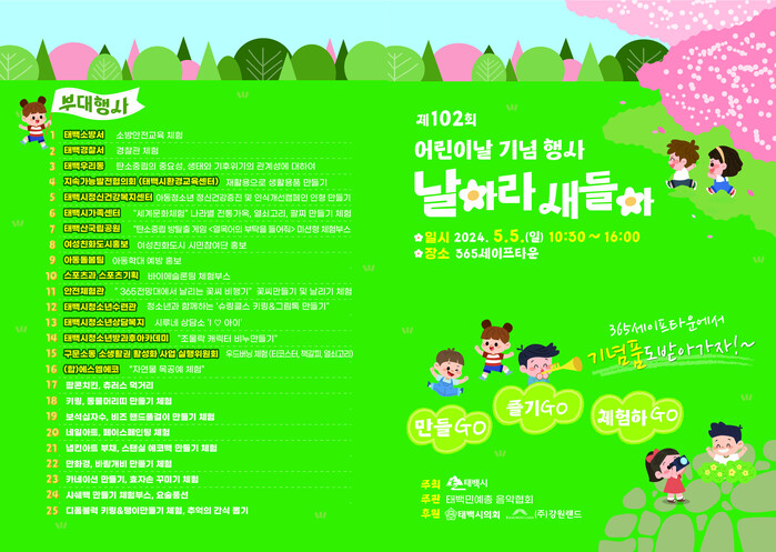 시 관계자는 “제102회 어린이날을 맞이하여 어린이를 위한 다양한 체험프로그램을 운영하니 많은 관심과 참여를 바라며, 우리의 미래인 어린이들이 꿈과 희망을 품고 행복하게 자라날 수 있도록 태백시가 함께 하겠다”고 전했다.