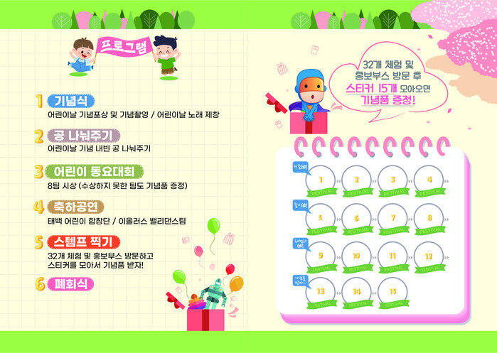 이어지는 축하공연에는 태백어린이 합창단 공연과 어린이 동요대회, 키즈 밸리댄스 공연이 펼쳐진다.