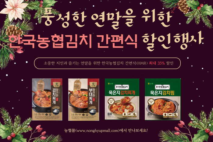 농협(회장 이성희)경제지주는 크리스마스와 연말을 앞두고 홈파티를 준비하는 고객들을 위해 5일부터 오는 18일까지 2주일간 농협몰에서 한국농협김치 HMR상품 4종을 최대 35% 할인 판매한다.