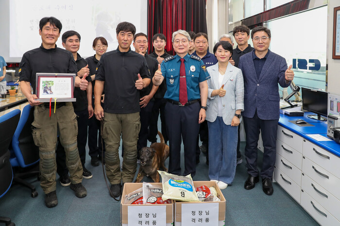[로컬세계 부산=맹화찬 기자]지난달 27일 15:30경, 동래구 주거지에서 치매 남편이 없어진 것을 외출하고 돌아온 처가 경찰에 신고했고 실종 엿새째 과학수사대 체취증거견 2마리가 금정산 동문 일대 중점 수색하던 중 8월 1일 07:40경 체취견 야크(말리노이즈, 5세)가 금정산 5부 능선 숲속에서 탈진해 쓰러져 있는 실종자를 발견, 소중한 생명을 구했다.