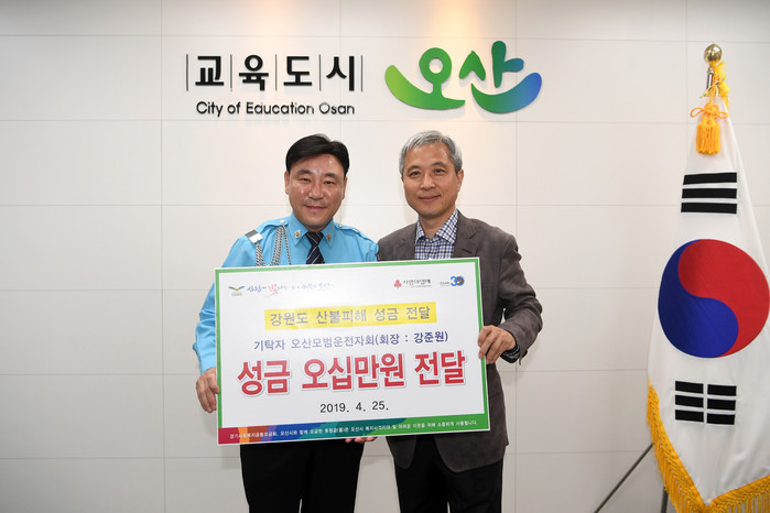 | ▲전국모범운전자연합회 오산시지회는 25일 시장 집무실을 방문해 강원도 산불피해 성금 50만원을 기탁했다.(오산시 제공) |