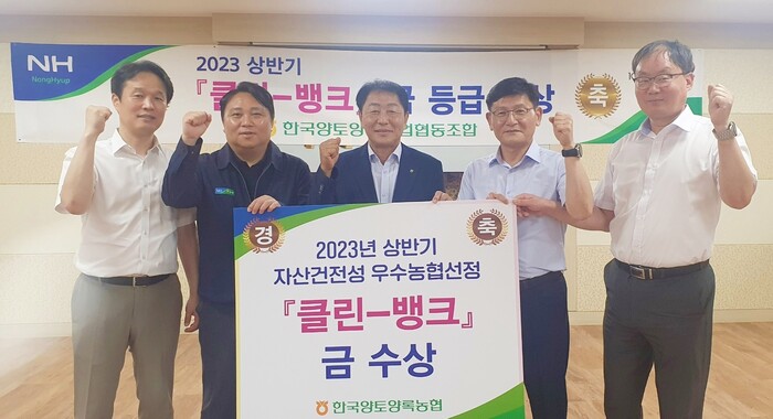 ▲ 한국양토양록농협(조합장 안현구, 사진 가운데)이 2023년 상반기 농협중앙회 클린뱅크 평가에서 금 등급을 수상했다. 서울농협 제공 |