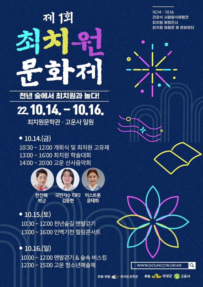 문화제 마지막날인 16일 일요일에는 10시부터 천년숲길 맨발걷기와 숲속버스킹이, 그리고 12시부터 주무대에서 고운청소년문화예술제가 열린다. 고운청소년문화예술제에는 관내 청소년들이 K-POP 댄스, 태권무 등 그동안 갈고 닦은 실력들을 한껏 뽐낸다.