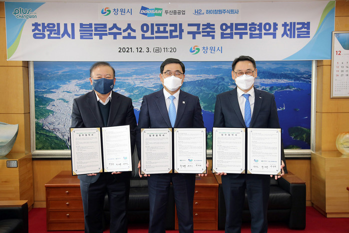 시는 3일 오전 11시20분 시청 접견실에서 허성무 시장을 비롯한 정연인 두산중공업 대표이사, 백정한 하이창원 대표이사가 참석한 가운데 ‘창원 액화수소플랜트 이산화탄소 포집·활용 사업을 위한 업무협약’을 체결했다.