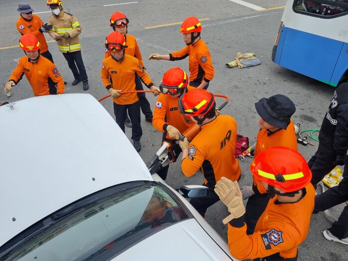 주요 훈련 내용으로는 ▲대형버스 구조 이해 및 버스 인양 ▲에어백과유압장비 등을 활용한 차량 문 개방 및 본넷 개방 ▲유리절단기 및 파괴기구를 활용한 차량 유리 제거 ▲고임목 및 지지대를 활용한 차량 안정화 등이다.