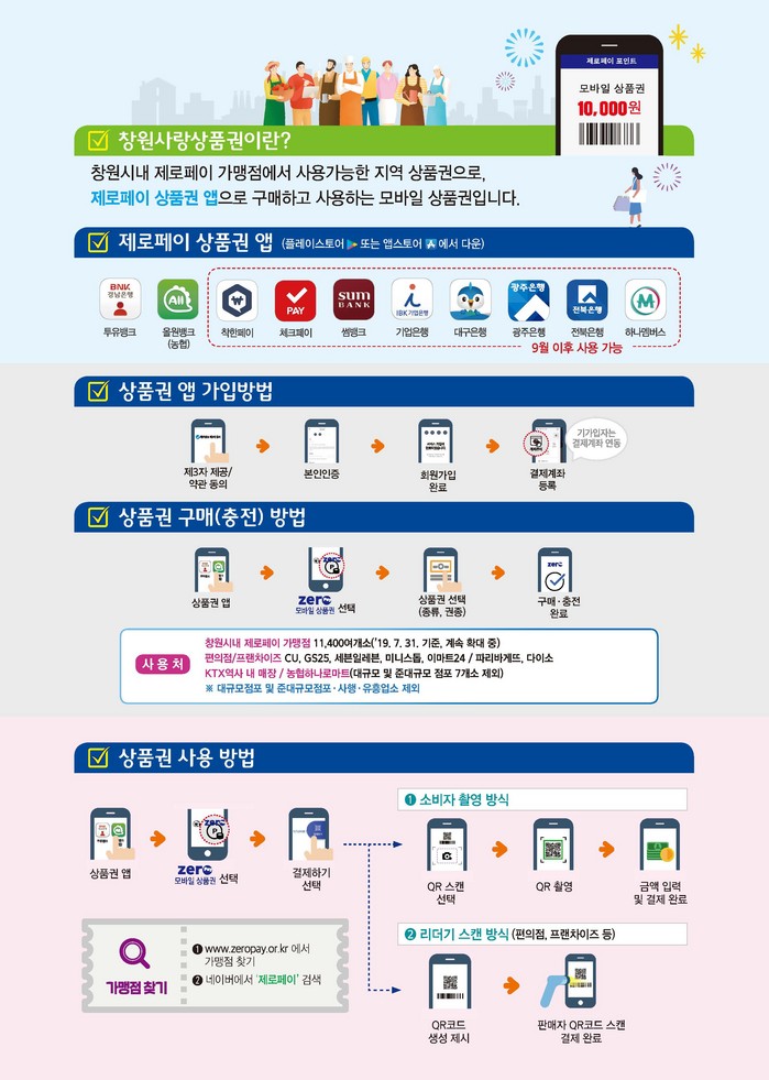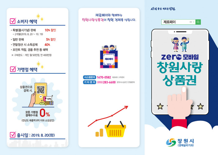 자세한 내용은 제로페이 고객센터(☎ 1670-0582), 창원시 소상공인 민원콜센터(☎ 055-283-6600)로 문의하면 된다.