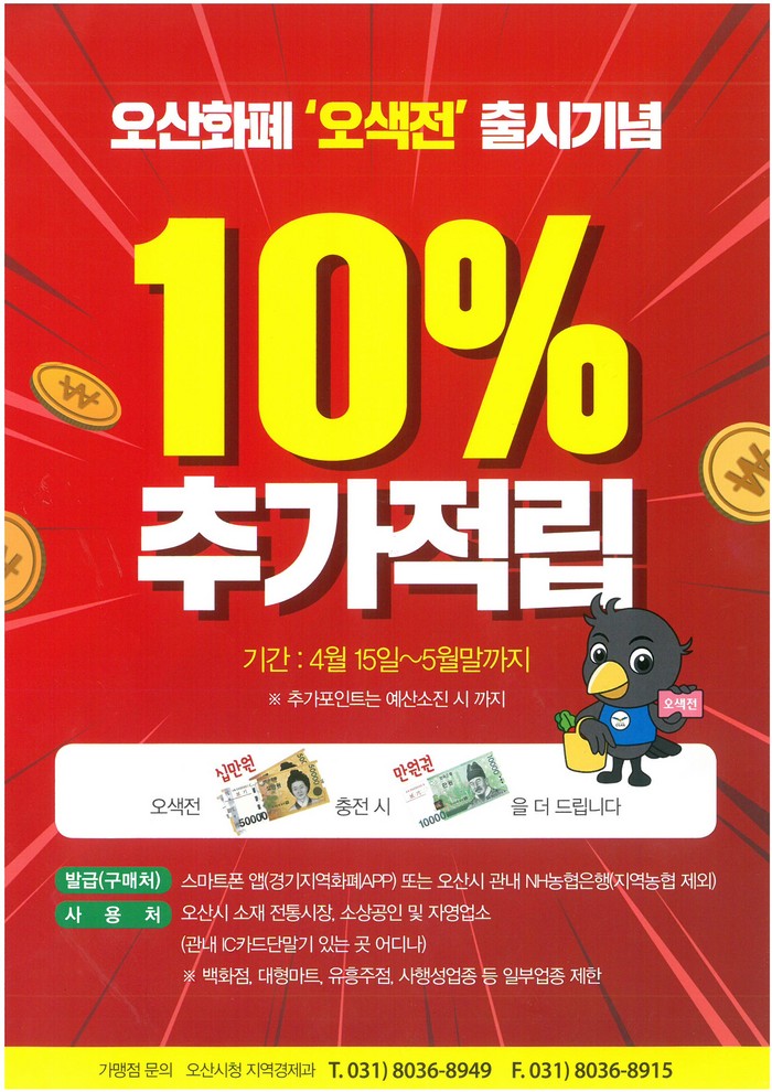 [로컬세계 고용주 기자]경기 오산시의 지역화폐인 ‘오색전’이 지난 15일 공식 출시됐다.