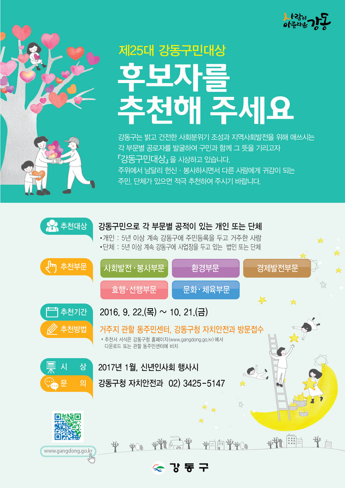 수상자는 공적에 대한 현지 사실 확인 조사를 거쳐 강동구민대상 공적심사위원회에서 결정되며 시상식은 2017년 1월 신년인사회 때 열릴 예정이다.