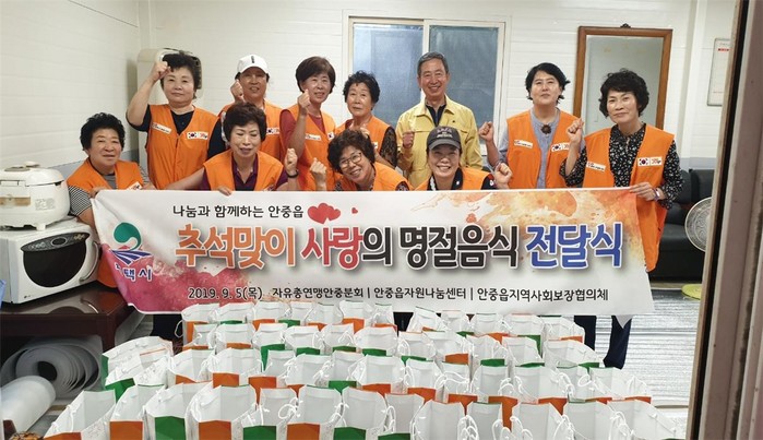 안중읍자원나눔센터 회원들이 직접 떡, 전, 밑반찬 7가지의 음식을 만들어 안중읍지역사회보장협의체로 전달했다.