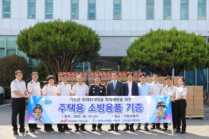 [로컬세계 부산=맹화찬 기자]부산 기장소방서와 한국수력원자력 고리원자력본부가 15일 오후 기장소방서에서 ‘주택용 소방시설 보급 및 보이는 소화기함 설치’ 사업을 위한 주택용 소방용품 기증식을 진행하였다.