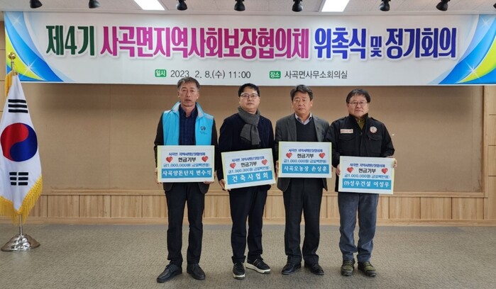 [로컬세계=박상진 기자]경북 의성군 사곡면은 지난 8일 제4기 지역사회보장협의체 위촉식에서 사곡양돈단지 대표 변수석, 사곡오농장 대표 손상훈, ㈜성우건설 이성우, 의성건축사협회 대표가 참석해 취약계층을 위한 복지사업에 사용해줄 것을 부탁하며 각 100만원씩 기부금 총400만원을 전달했다.