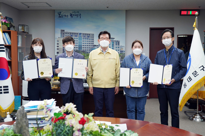 수상자는 총 4명으로 체육진흥과 김영한 체육시설팀장이 서울시장 표창을, △부동산정보과 문원희 지적관리팀장 △맑은환경과 김성자 주무관 △전농2동 양다솜 주무관이 동대문구청장 표창을 받았다.