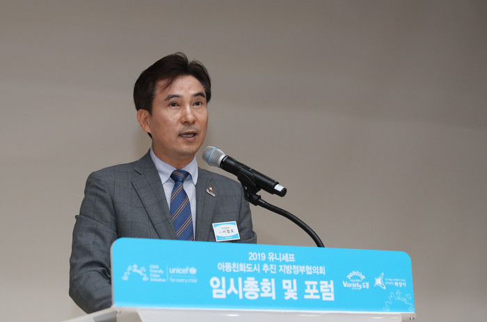 | ▲서철모 화성시장이 24일 화성시어린이문화센터에서 열린 2019 ‘유니세프 아동친화도시 추진 지방정부협의회’에서 인사말을 하고 있다.(화성시 제공) |