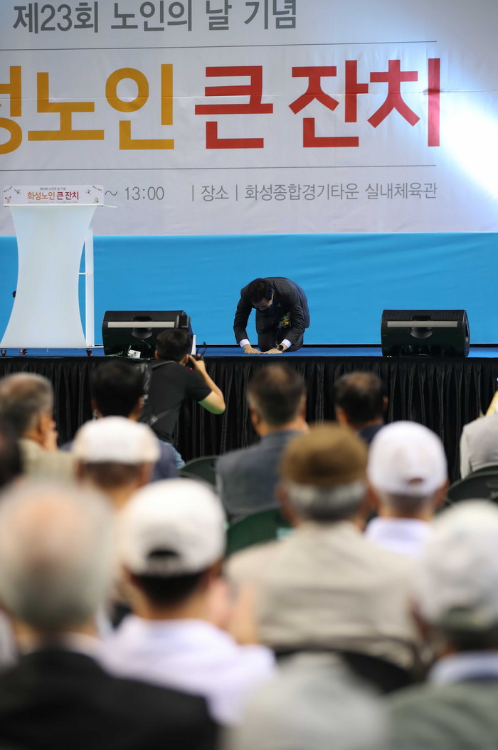 | ▲노인의 날 기념식에서 참석한 어르신에게 큰절을 올리고 있는 서철모 화성시장. |