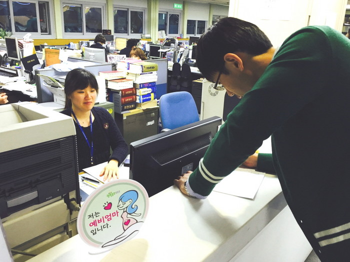 구는 임산부 알림 명패를 제작해 민원창구에 비치하고, 임산부를 위한 쉼터를 마련하며, 모성보호시간을 도입하는 등 안정적인 근무환경 조성에 나섰다.