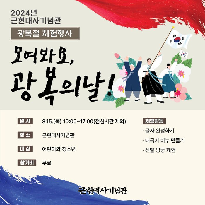 근현대사기념관을 방문하는 시민들을 대상으로 진행하는 이 행사는 오전 10시부터 오후 5시까지 글자 완성하기, 태극기 비누 만들기, 신발 양궁 등을 체험할 수 있으며, 참가하는 어린이들은 독립운동 부루마블, 역사 동화책, 독립운동가 뱃지 등을 받을 수 있다.
