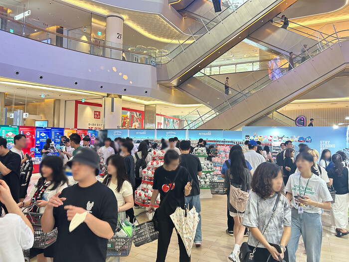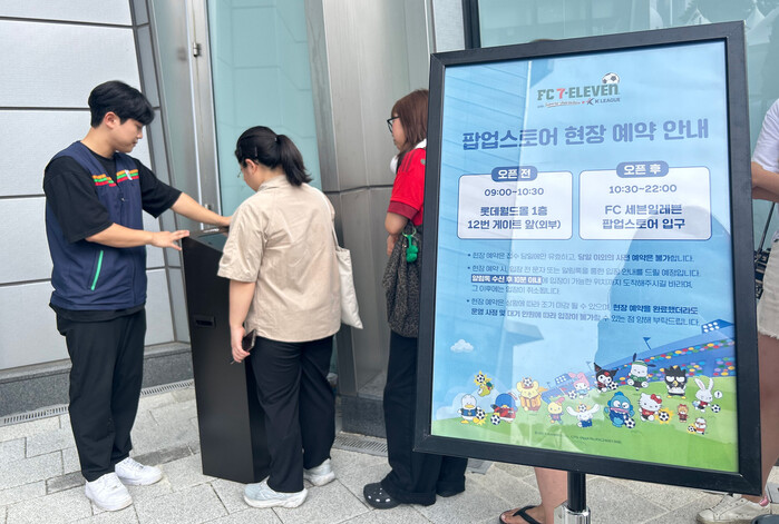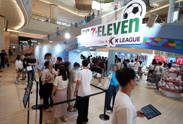 ▲편의점 세븐일레븐이 19일부터 내달 11일까지 잠실 롯데월드타워 일대에서 ‘FC 세븐일레븐 with 산리오, K리그' 팝업스토어를 운영한다. 팝업스토어가 오픈한 오전부터 매장 내부가 관련 굿즈 상품을 구매하기 위한 고객들로 인산인해를 이루었다. |