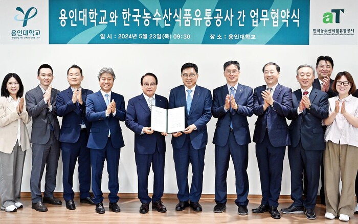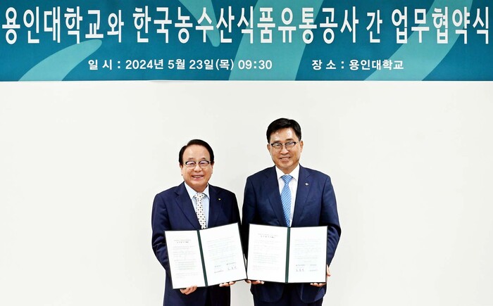 한국농수산식품유통공사(사장 김춘진)와 용인대학교(총장 한진수)는 23일 용인대학교 캠퍼스에서 농수산식품 산업 발전을 위한 미래 인재 양성과 지속 가능한 먹거리 환경 조성을 위해 업무협약을 체결했다.