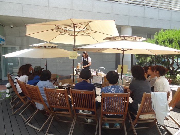 ▲마포구청 12층에 위치한 하늘도서관에서 시민들이 커피 내리는 법을 배우고 있다. |