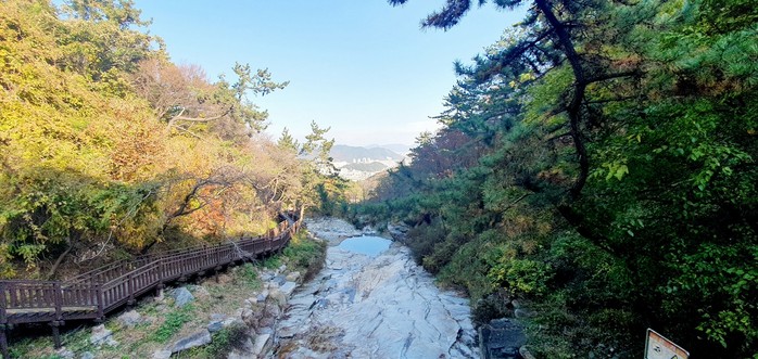 | ▲서원곡을 따라 데크가 조성돼있고, 멀리 마산만과 시가지가 내려다보인다. |