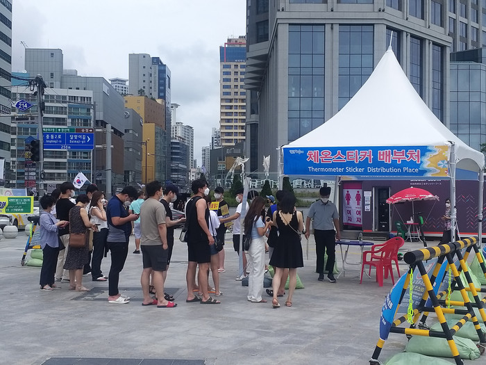 [로컬세계 맹화찬 기자]부산 해운대구는 해운대와 송정해수욕장을 찾은 방문객에게 체온스티커를 배부하고 있다고 20일 밝혔다.