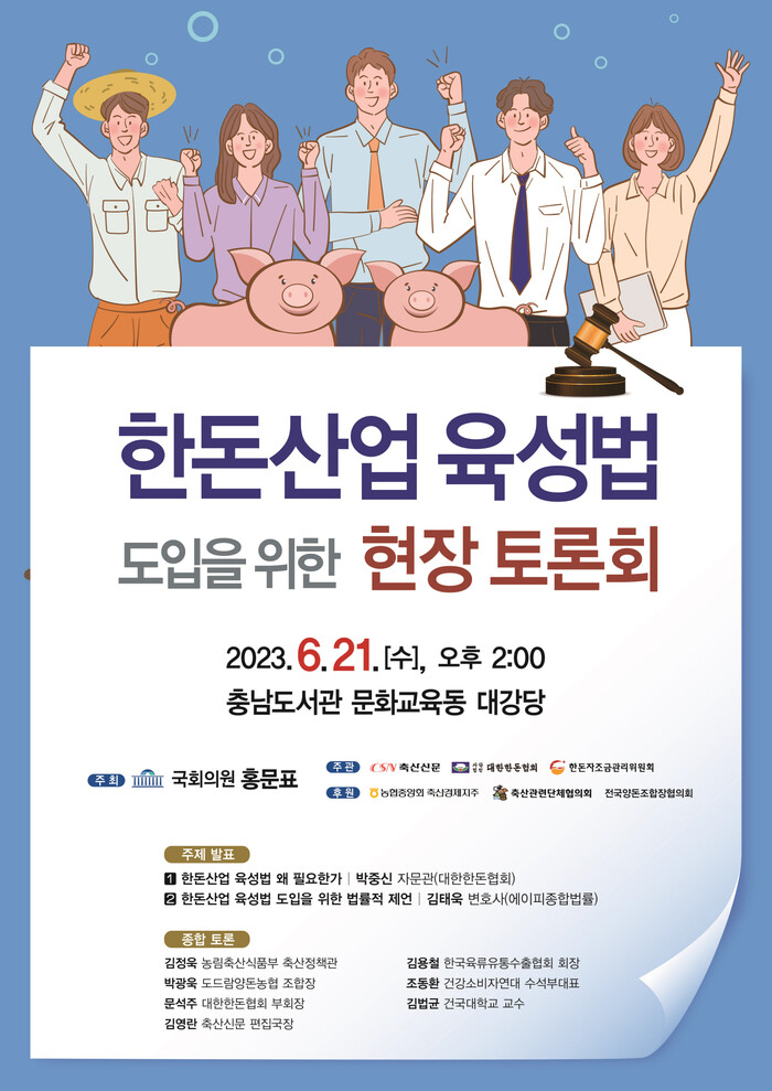 오는 21일 홍성 소재 충남도서관 문화교육동 대강당에서 열리는 이번 토론회는 국민의힘 홍문표(충남 예산·홍성) 의원이 주최하고 대한한돈협회와 한돈자조금관리위원회, 축산신문사가 주관하고, 농협경제지주, 축산관련단체협의회, 전국양돈조합장협의회가 후원한다.
