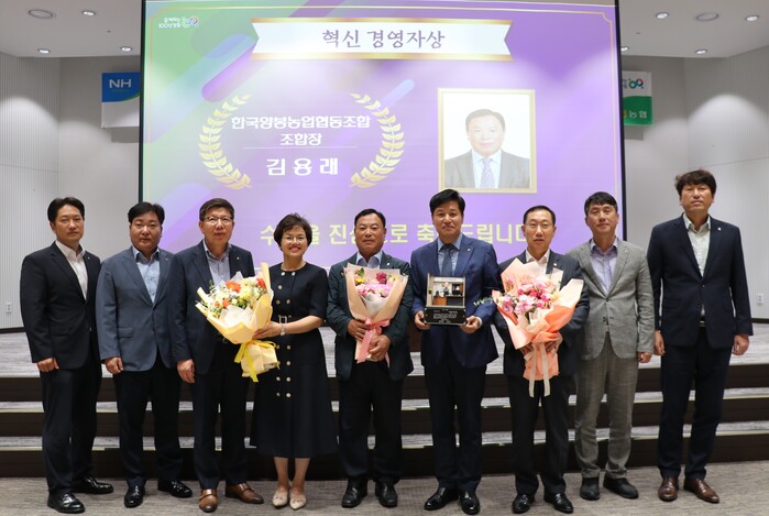 ▲ 2023년 상반기 혁신경영자상을 수상한 김용래 한국양봉농협 조합장과 임직원들이 기념촬영을 하고 있다. (사진은 왼쪽 4번째부터 조은주 NH농협은행 서울본부장, 김용래 한국양봉농협 조합장, 황준구 농협중앙회 서울본부장) |
