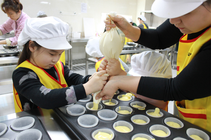 ▲지난 31일 성동구 도시관리공단 직원의 딸이 사랑의 빵을 만들고 있다. ©로컬세계 |