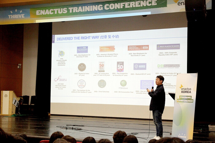 ▲ 한국이콜랩 ESG위원회 김태국 과장이 인액터스 트레이닝 컨퍼런스에서 ‘햇반 용기 자원순환 임팩트 스케일업 프로그램’에 대해 소개하고 있다. 한국이콜랩 제공 |