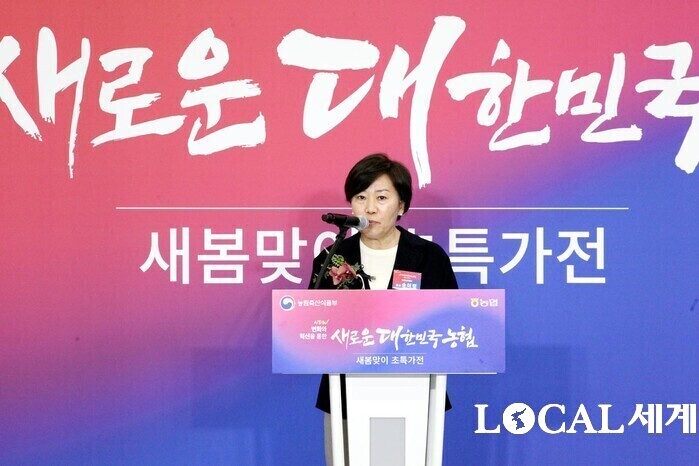 농협중앙회는 25일 서울 농협하나로마트 양재점에서 농식품부 송미령 장관과 강호동 농협중앙회장이 참석한 가운데 ‘새로운 대한민국 농협 새봄맞이 초특가전!’ 행사를 개최했다. 송미령 장관이 인사말을 하고 있다.