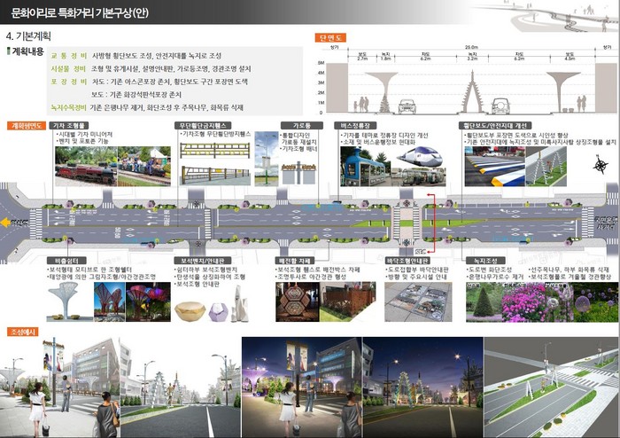이와 함께 어두웠던 도심지역을 환하고 다채로운 빛으로 비추는 경관 조형물이 설치되고 그간 도로변 발육이 불량했던 은행나무 가로수를 대신해 낮은 높이로 간판을 가리지 않되 사시사철 푸르고 풍성한 가로수들이 식재된다.