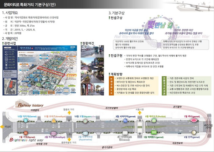 해당 거리 인도의 양쪽 300미터 구간에 기차의 변천과정을 친근하고 재미있는 조형물들로 배치하고 12개의 탄생석(보석)을 모티브로 한 공공시설물(쉼터의자 등)이 설치된다.