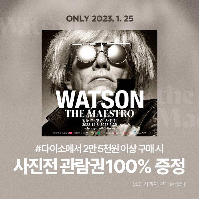 이번 이벤트는 모바일 쇼핑앱 샵(#)다이소에서만 진행되며, 이번 달 25일 단 하루 동안 샵(#)다이소에서 2만 5천원 이상 구매 시 <알버트 왓슨 사진전> 관람권(1인 2매)을 소진 시까지 100% 증정한다. 자세한 사항은 샵(#)다이소 앱에서 확인할 수 있다.