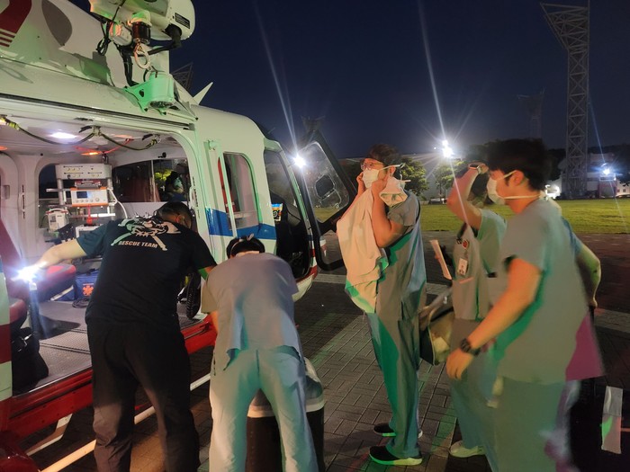 부산소방헬기는 적출수술이 진행되는 강릉 아산병원에서 대기 후 오후 8시 25분 이륙해 1시간 20분간의 야간비행을 마치고 오후 9시45분에 기증장기(간,폐)를 양산부산대병원 이식팀에 무사히 전달했다.