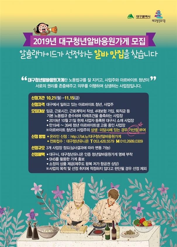 김요한 대구시 청년정책과장은 “대구청년알바 응원가게 발굴을 통해 정당한 권익보장을 비롯해 사업주와 아르바이트 청년이 서로를 존중하고 배려하는 분위기가 확산될 수 있도록 적극 노력하겠다”고 말했다.