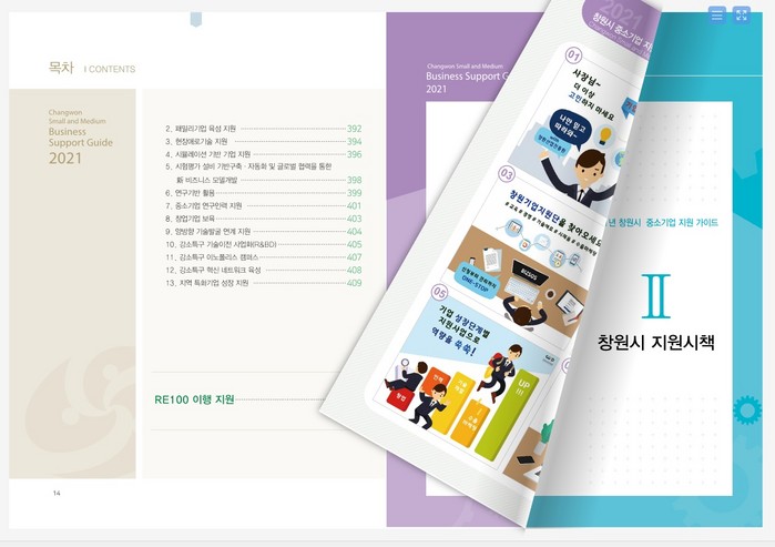 또 중소기업 지원가이드 책자 보급의 한계를 극복하고 접근성을 높이기 위해 전자책(e-book) 형태로도 제작하여 창원시 또는 창원기업지원단 홈페이지를 통해 제공한다. e-book 형태의 ‘창원시 중소기업 지원 가이드’는 항상 휴대하고 있는 스마트폰으로도 볼 수 있고, 자동 슬라이드, 목차에서 바로 해당 페이지로 이동, 검색, 공유, 다운로드 등의 기능이 있어 편의성을 크게 제고한 셈이다.