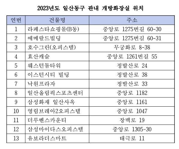[로컬세계 = 이영원 기자]경기 고양특례시 일산동구는 시민 편의 증진을 위해 ‘개방화장실’을 지정하고자 작년 12월 7일부터 21일까지 지정 신청·접수를 진행했고, 총 13개의 개방화장실을 지정했다고 11일 밝혔다.