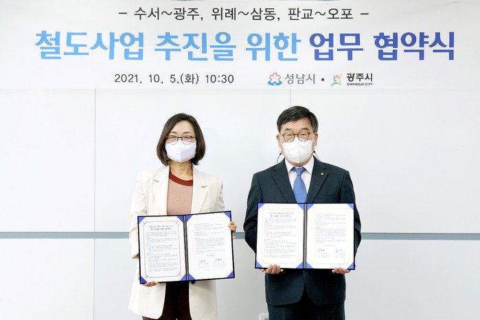 [로컬세계 김병민 기자]경기 광주시는 5일 성남시청 회의실에서 신동헌 광주시장, 은수미 성남시장 등이 참석한 가운데 ‘광주·성남간 철도사업의 상호지원 및 협력체계 강화를 위한 업무협약’을 체결했다고 밝혔다.