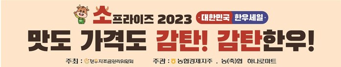 한편, 농협은 지난 17일부터 19일까지 실시한 '2023 소프라이즈 한우세일' 행사를 통해 당초 계획물량인 400톤을 훨씬 뛰어넘는 약 568톤(4,700두)을 판매했으며, 구매자들이 받은 할인혜택은 약 150억원에 이른다고 밝혔다.