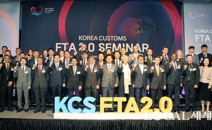 2일 고광효 관세청장(앞줄 가운데)과 참석자들이 기념촬영을 하고 있다. 관세청은 자유무역협정(FTA) 발효 20주년을 기념해 2일부터 4일까지 3일간 서울 인터컨티넨탈 호텔에서 해외 관세당국 및 FTA 관계자 200여 명을 초청해 ‘FTA 2.0 세미나’를 개최한다.