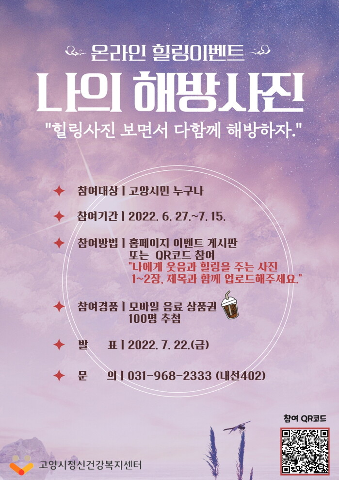 이벤트 참여는 나에게 웃음과 힐링을 주는 사진을 제목과 함께 업로드하면 된다. 이벤트는 고양시정신건강복지센터 홈페이지 이벤트 게시판 혹은 QR코드 접속을 통해 참여 가능하다.