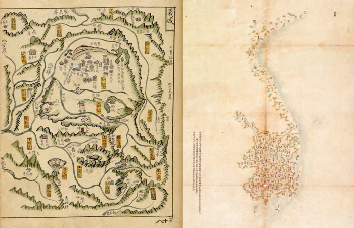 | ▲의성 18세기 국립중앙도서관 대한지도 및 연혁도칠폭(신라) 19세기 영남대박물관 소장 지도.(의성군 제공) |