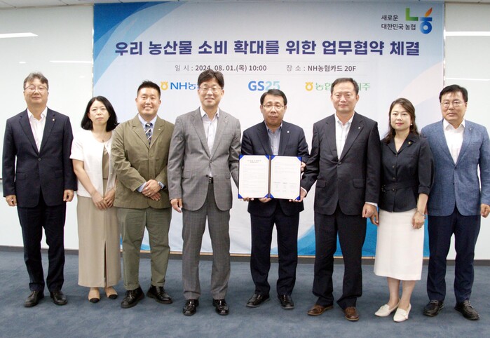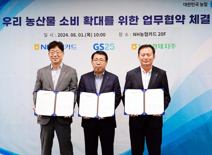 농협경제지주(농업경제대표이사 박서홍)가 지난 1일 NH농협카드, GS25와 국산 농산물 소비확대를 위한 3자 간 업무협약(MOU)을 체결했다.