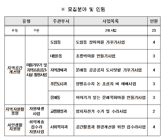일자리는 마을가꾸기 및 지역유휴공간·시설활용을 비롯해 ▲자원재생 ▲취약계층 집수리 지원 등 총 3개 분야의 7개 사업에서 모집한다.