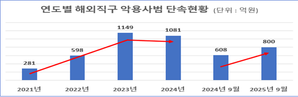 관세청에 따르면 올해 1~9월 적발된 해외직구 악용 범죄 규모는 총 800억 원으로, 전년 동기 대비 32% 증가했다. 이 중 개인 사용을 가장한 판매용 수입 밀수 등 관세사범이 563억 원, 위조상품 등 지재권 침해가 218억 원, 불법 식의약품 반입 등이 19억 원을 차지했다.