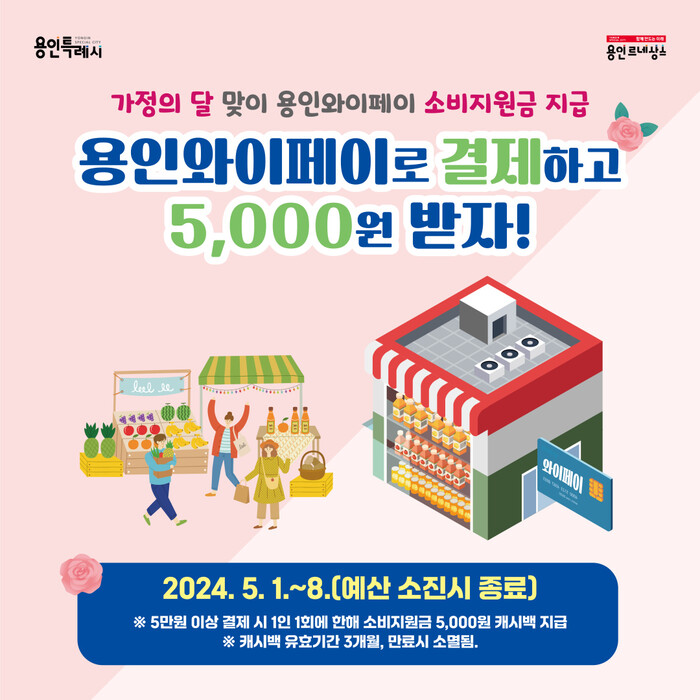 행사에서는 용인와이페이 카드로 5만원 이상 결제 시 소비지원금 5000원을 즉시 지급한다. 지급 내역은 경기지역화폐 앱을 통해 확인할 수 있고 유효기간 3개월 안에 용인와이페이 가맹점에서 결제 시 사용하면 된다.
