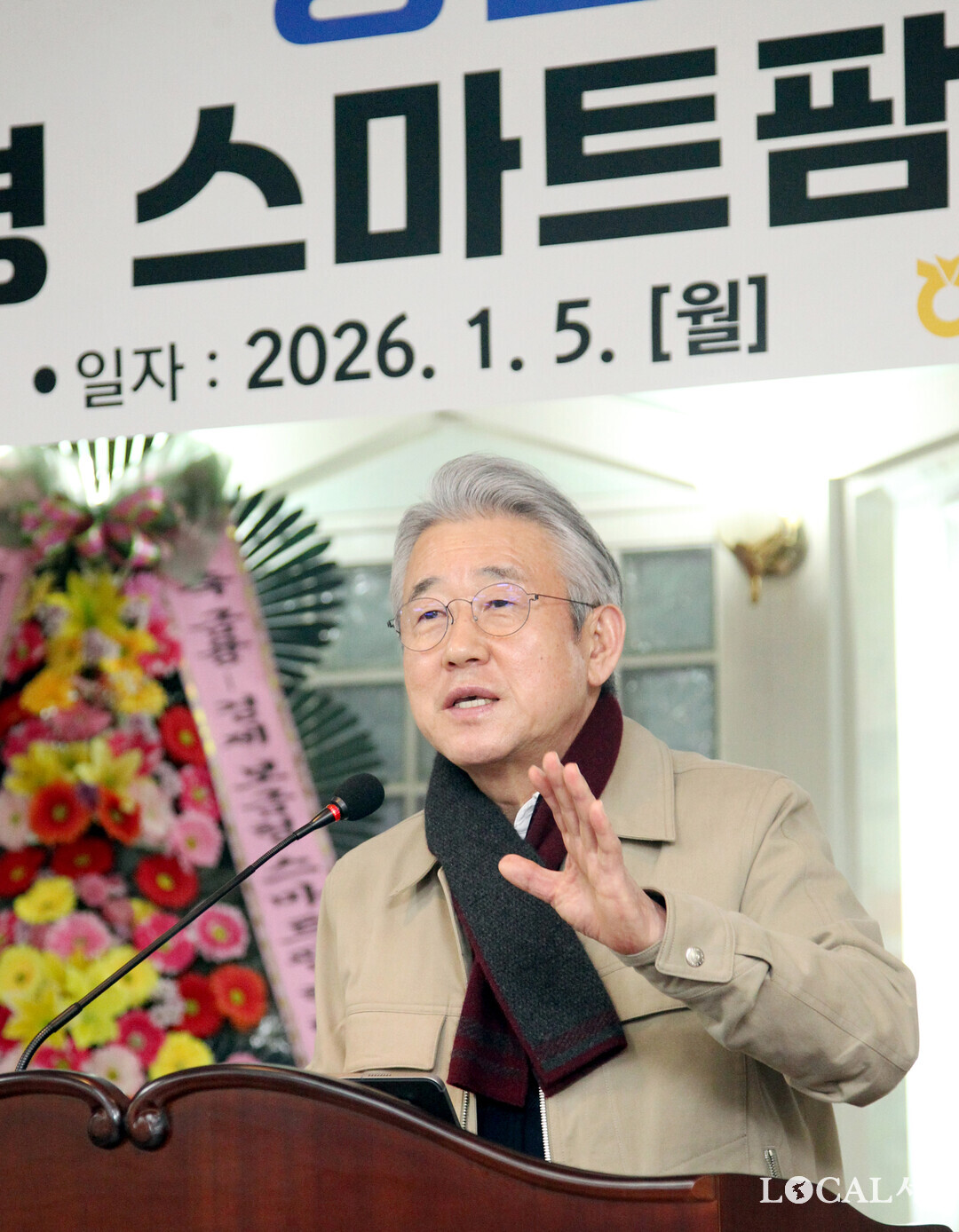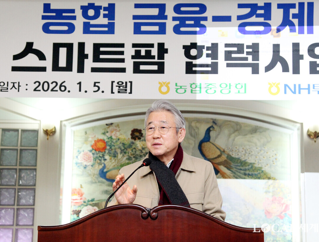 강호동 농협중앙회장은 5일 새해 첫 현장경영으로 충남 논산 강경농협에서 열린「농협금융-경제 보급형 스마트팜 협력사업 기념식」에 참석했다. 강호동 농협중앙회장이 인사말을 하고 있다.