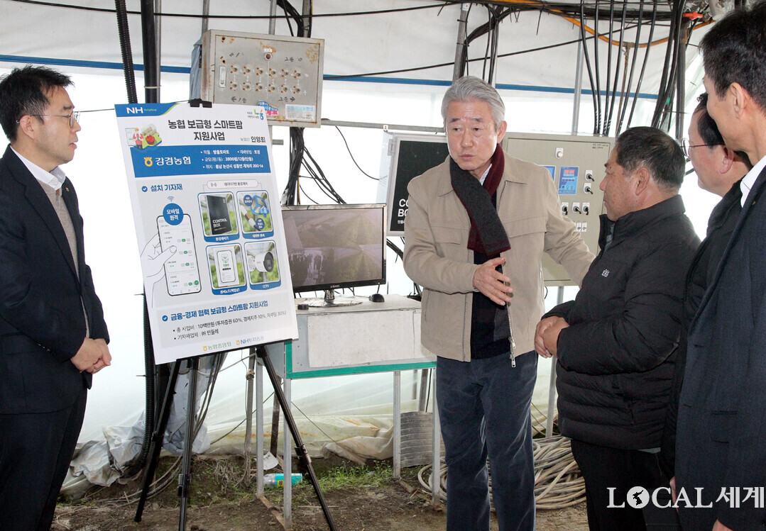 강호동 농협중앙회장은 5일 새해 첫 현장경영으로 충남 논산 강경농협에서 열린「농협금융-경제 보급형 스마트팜 협력사업 기념식」에 참석했다. 강호동 농협중앙회장이 보급형 스마트팜 형황을 보고받고 있다.