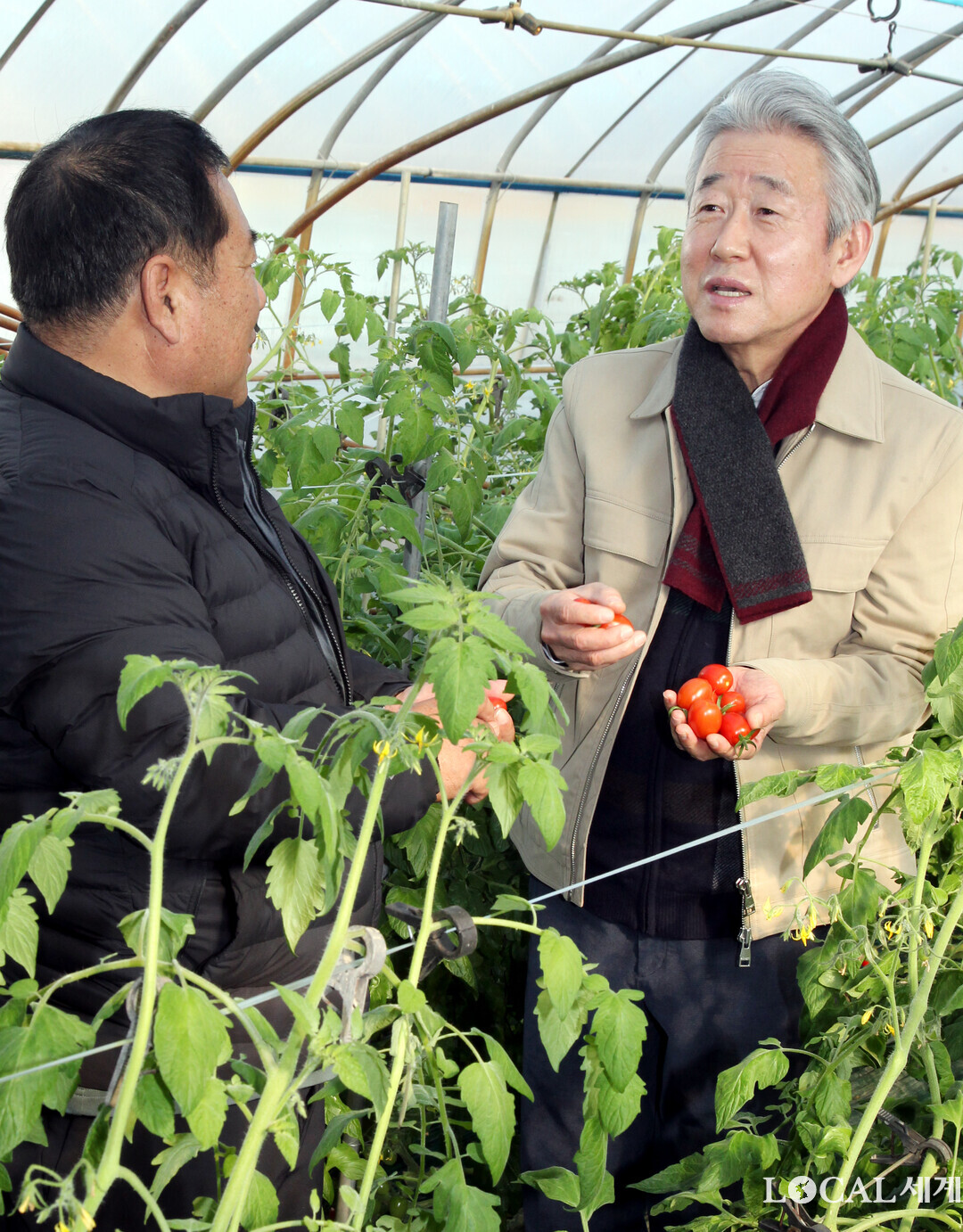 강호동 농협중앙회장은 5일 새해 첫 현장경영으로 충남 논산 강경농협에서 열린「농협금융-경제 보급형 스마트팜 협력사업 기념식」에 참석했다. 강호동 농협중앙회장이 농업인 인영희 씨와 토마토 하우스를 순람하고 있다.